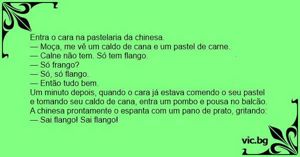 Um minuto depois, quando o cara já estava comendo o seu pastel e tomando seu caldo de cana, entra um pombo e pousa no balcão. A chinesa prontamente o espanta com um pano de prato, gritando: