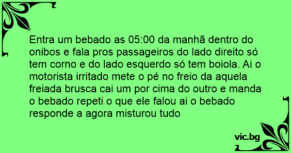 Entra um bebado as 05:00 da manhã dentro do onibos e fala pros passageiros do lado direito só tem соrnо e do lado esquerdo só tem воiоlа. Ai o motorista irritado mete o pé no freio da aquela freiada brusca cai um por cima do outro e manda o bebado repeti o que ele falou ai o bebado responde a agora misturou tudo