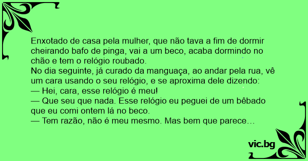 No dia seguinte, já curado da manguaça, ao andar pela rua, vê um cara usando o seu relógio, e se aproxima dele dizendo: