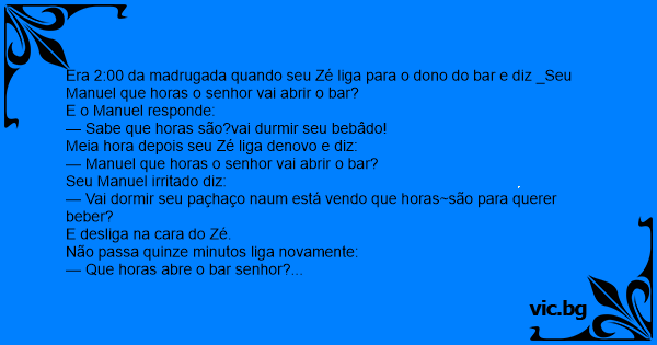 Era 2:00 da madrugada quando seu Zé liga para o dono do bar e diz _Seu Manuel que horas o senhor vai abrir o bar?