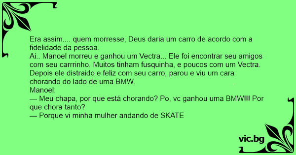 Ai.. Manoel morreu e ganhou um Vectra... Ele foi encontrar seu amigos com seu carrrinho. Muitos tinham fusquinha, e poucos com um Vectra.