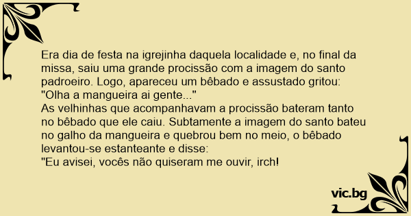 As velhinhas que acompanhavam a procissão bateram tanto no bêbado que ele caiu. Subtamente a imagem do santo bateu no galho da mangueira e quebrou bem no meio, o bêbado levantou-se estanteante e disse: