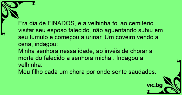 Era dia de FINADOS, e a velhinha foi ao cemitério visitar seu esposo falecido, não aguentando subiu em seu túmulo e começou a urinar. Um coveiro vendo a cena, indagou: