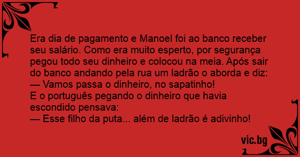 Era dia de pagamento e Manoel foi ao banco receber seu salário. Como era muito esperto, por segurança pegou todo seu dinheiro e colocou na meia. Após sair do banco andando pela rua um ladrão o aborda e diz: