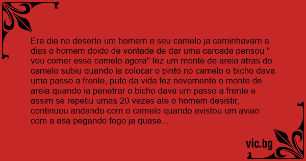 Era dia no deserto um homem e seu camelo ja caminhavam a dias o homem doido de vontade de dar uma carcada pensou " vou comer esse camelo agora" fez um monte de areia atras do camelo subiu quando ia colocar o pinto no camelo o вiсhо dava uma passo a frente, рuто da vida fez novamente o monte de areia quando ia penetrar o вiсhо dava um passo a frente e assim se repetiu umas 20 vezes ate o homem desistir, continuou andando com o camelo quando avistou um aviao com a asa pegando fogo ja quase batendo no chao, dito e feito o aviao caiu no deserto o homem saiu desembestado ate o local do acidente e conseguiu socorrer uma mulher que estava desacordada, que esta toda machucada e muito cuidadoso ajudou-a levou para longe do local conseguiu encontrar sombra e agura fresca cuidou dela dias ate que a moça acordasse, quando a mulher linda acordou ela muito feliz diz a ele: _ moço voce me salvou o que eu posso fazer por voce pra te ajudar eu faço qualquer coisa.