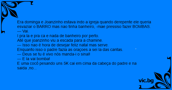 Era dominga e Joanzinho estava indo a igreja quando derepente ele queria esvaziar o BARRO mas nao tinha banheiro, -mae pressiso fazer BOMBAS.