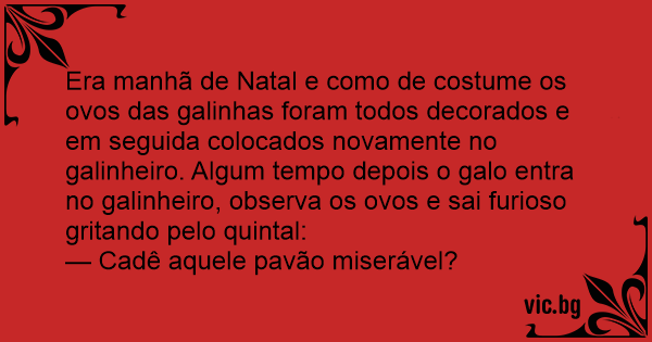 Era manhã de Natal e como de costume os ovos das galinhas foram todos decorados e em seguida colocados novamente no galinheiro. Algum tempo depois o galo entra no galinheiro, observa os ovos e sai furioso gritando pelo quintal: