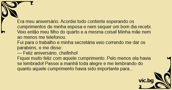 Era meu aniversário. Acordei todo contente esperando os cumprimentos de minha esposa e nem sequer um bom dia recebi. Veio então meu filho do quarto e a mesma coisa! Minha mãe nem ao menos me telefonou.