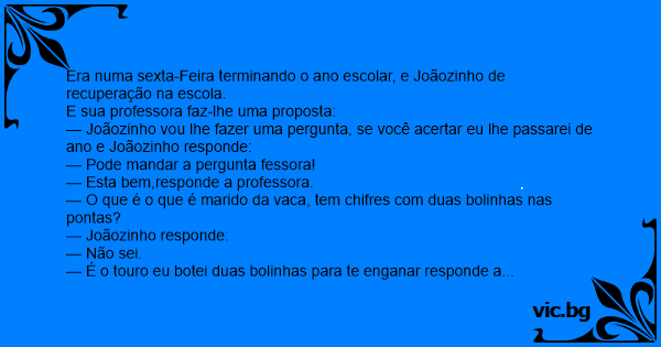 — Joãozinho vou lhe fazer uma pergunta, se você acertar eu lhe passarei de ano e Joãozinho responde: