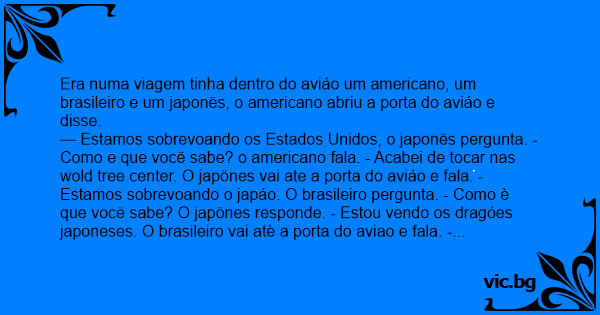 — Estamos sobrevoando os Estados Unidos, o japonës pergunta. - Como e que vocë sabe? o americano fala. - Acabei de tocar nas wold tree center. O japönes vai ate a porta do aviáo e fala. -Estamos sobrevoando o japáo. O brasileiro pergunta. - Como è que vocë sabe? O japönes responde. - Estou vendo os dragóes japoneses. O brasileiro vai atè a porta do aviao e fala. - Estamos sobrevoando o Brasil. O americano pergunta. - Como è que voce sabe. O brasileiro responde. - Porque acabaram de roubar meu relògio.