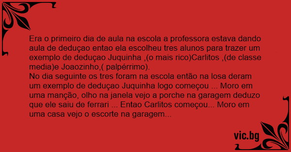 No dia seguinte os tres foram na escola então na losa deram um exemplo de deduçao Juquinha logo começou ... Moro em uma manção, olho na janela vejo a porche na garagem deduzo que ele saiu de ferrari ... Entao Carlitos começou... Moro em uma casa vejo o escorte na garagem deduzo que meu pai saiu de Omega ... Entao Joaozinho continuou ... moro em meu barraco olho pela janela meu pai empurrando a porta e subindo o morro com um jornal nas mãos deduzo que ele foi caga pois não sabe ler...