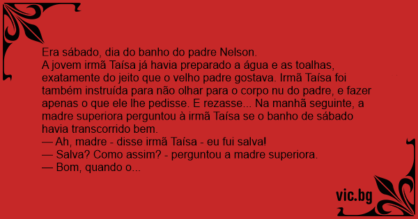 A jovem irmã Taísa já havia preparado a água e as toalhas, exatamente do jeito que o velho padre gostava. Irmã Taísa foi também instruída para não olhar para o corpo nu do padre, e fazer apenas o que ele lhe pedisse. E rezasse... Na manhã seguinte, a madre superiora perguntou à irmã Taísa se o banho de sábado havia transcorrido bem.