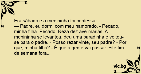 — Padre, eu dormi com meu namorado. - Pecado, minha filha. Pecado. Reza dez ave-marias. A menininha se levantou, deu uma paradinha e voltou-se para o padre. - Posso rezar vinte, seu padre? - Por que, minha filha? - É que a gente vai passar este fim de semana fora...