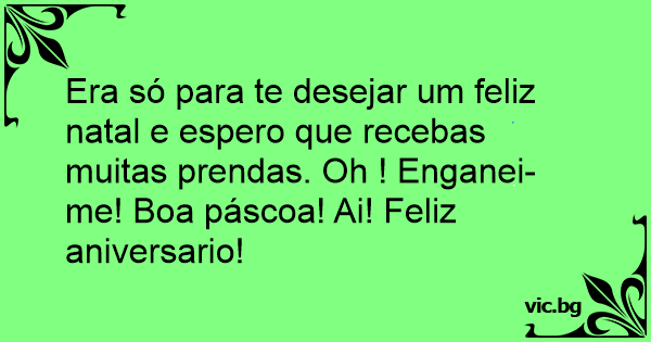 Era só para te desejar um feliz natal e espero que recebas muitas prendas. Oh ! Enganei-me! Boa páscoa! Ai! Feliz aniversario!