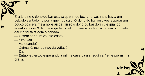 Era tarde e o dono do bar estava querendo fechar o bar, mais havia um bebado sentado na porta que nao saia. O dono do bar resolveu esperar um pouco pois era meia noite ainda, nisso o dono do bar dormiu e quando acordou ja era 3 da madrugada ele olhou para a porta e la estava o bebado dai ele foi falra com o bebado.