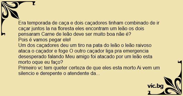 Um dos caçadores deu um tiro na pata do leão o leão raivoso ataca o caçador e foge O outro caçador liga pra emergencia desesperado falando Meu amigo foi atacado por um leão esta morto oque eu faço?
