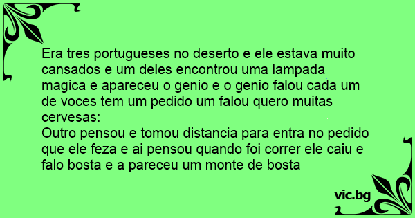 Era tres portugueses no deserto e ele estava muito cansados e um deles encontrou uma lampada magica e apareceu o genio e o genio falou cada um de voces tem um pedido um falou quero muitas cervesas: