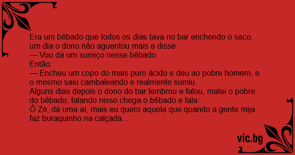 Alguns dias depois o dono do bar lembrou e falou, matei o pobre do bêbado, falando nisso chega o bêbado e fala: