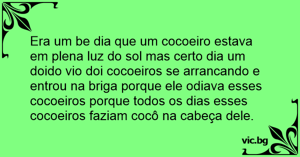 Era um be dia que um cocoeiro estava em plena luz do sol mas certo dia um doido vio doi cocoeiros se arrancando e entrou na briga porque ele odiava esses cocoeiros porque todos os dias esses cocoeiros faziam cocô na cabeça dele.