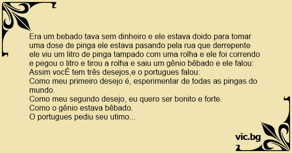 Era um bebado tava sem dinheiro e ele estava doido para tomar uma dose de pinga ele estava pasando pela rua que derrepente ele viu um litro de pinga tampado com uma rolha e ele foi correndo e pegou o litro e tirou a rolha e saiu um gênio bêbado e ele falou: