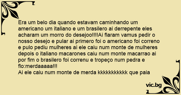 Era um belo dia quando estavam caminhando um americano um italiano e um brasilero ai derrepente eles acharam um morro do desejoo!!!!Ai flaram vamus pedir o nosso desejo e pular ai primero foi o americano foi correno e pulo pediu mulheres ai ele caiu num monte de mulheres depois o italiano macarones caiu num monte macarrao ai por fim o brasilero foi correnu e tropeço num pedra e flo:merdaaaaa!!!