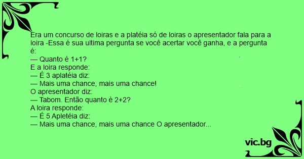 Era um concurso de loiras e a platéia só de loiras o apresentador fala para a loira -Essa é sua ultima pergunta se você acertar você ganha, e a pergunta é: