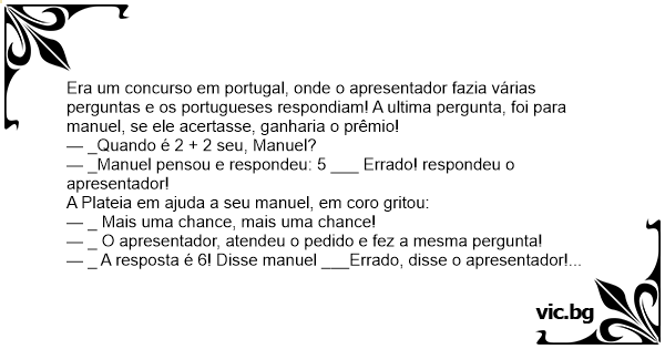Era um concurso em portugal, onde o apresentador fazia várias perguntas e os portugueses respondiam! A ultima pergunta, foi para manuel, se ele acertasse, ganharia o prêmio!