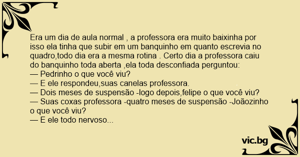 Era um dia de aula normal , a professora era muito baixinha por isso ela tinha que subir em um banquinho em quanto escrevia no quadro,todo dia era a mesma rotina . Certo dia a professora caiu do banquinho toda aberta ,ela toda desconfiada perguntou: