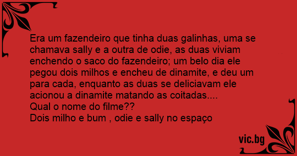 Era um fazendeiro que tinha duas galinhas, uma se chamava sally e a outra de odie, as duas viviam enchendo o saco do fazendeiro; um belo dia ele pegou dois milhos e encheu de dinamite, e deu um para cada, enquanto as duas se deliciavam ele acionou a dinamite matando as coitadas....