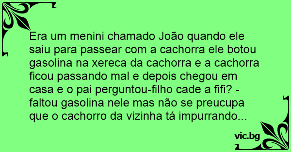 Era um menini chamado João quando ele saiu para passear com a сасhоrrа ele botou gasolina na xereca da сасhоrrа e a сасhоrrа ficou passando mal e depois chegou em casa e o pai perguntou-filho cade a fifi? -faltou gasolina nele mas não se preucupa que o сасhоrrо da vizinha tá impurrando...