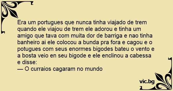 Era um portugues que nunca tinha viajado de trem quando ele viajou de trem ele adorou e tinha um amigo que tava com muita dor de barriga e nao tinha banheiro ai ele colocou a bunda pra fora e cagou e o potugues com seus enormes bigodes bateu o vento e a bosta veio en seu bigode e ele enclinou a cabessa e disse:
