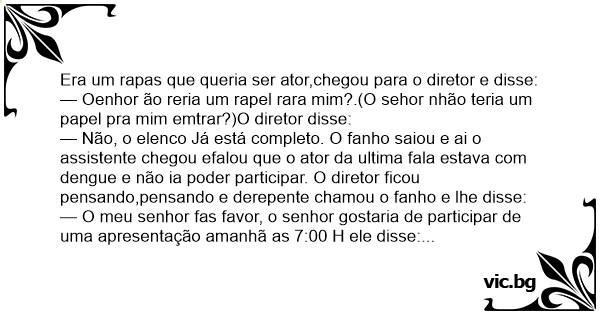 — Não, o elenco Já está completo. O fanho saiou e ai o assistente chegou efalou que o ator da ultima fala estava com dengue e não ia poder participar. O diretor ficou pensando,pensando e derepente chamou o fanho e lhe disse: