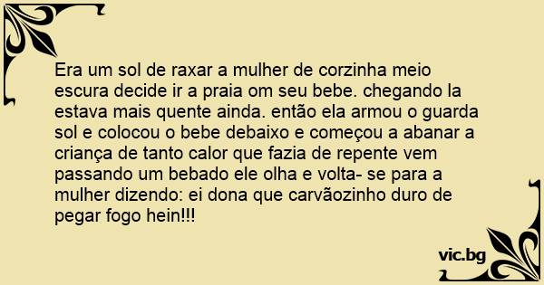 Era um sol de raxar a mulher de corzinha meio escura decide ir a praia om seu bebe. chegando la estava mais quente ainda. então ela armou o guarda sol e colocou o bebe debaixo e começou a abanar a criança de tanto calor que fazia de repente vem passando um bebado ele olha e volta- se para a mulher dizendo: ei dona que carvãozinho durо de pegar fogo hein!!!