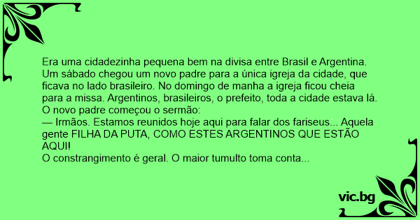 Um sábado chegou um novo padre para a única igreja da cidade, que ficava no lado brasileiro. No domingo de manha a igreja ficou cheia para a missa. Argentinos, brasileiros, o prefeito, toda a cidade estava lá.