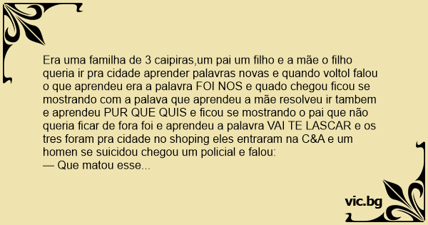 Era uma familha de 3 caipiras,um pai um filho e a mãe o filho queria ir pra cidade aprender palavras novas e quando voltol falou o que aprendeu era a palavra FOI NOS e quado chegou ficou se mostrando com a palava que aprendeu a mãe resolveu ir tambem e aprendeu PUR QUE QUIS e ficou se mostrando o pai que não queria ficar de fora foi e aprendeu a palavra VAI TE LASCAR e os tres foram pra cidade no shoping eles entraram na C&A e um homen se suicidou chegou um policial e falou: