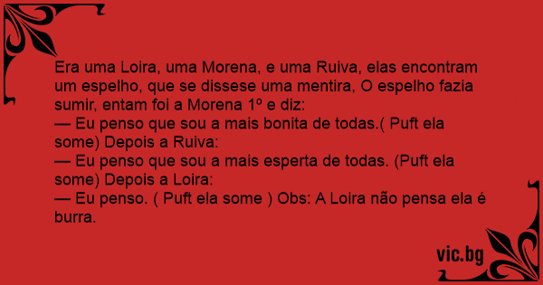 Era uma Loira, uma Morena, e uma Ruiva, elas encontram um espelho, que se dissese uma mentira, O espelho fazia sumir, entam foi a Morena 1º e diz: