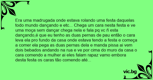 Era uma madrugada onde estava rolando uma festa daquelas todo mundo dançando e etc... Chega um cara nesta festa e ve uma moça sem dançar chega nela e fala pq vc ñ esta dançando,é que eu tenho as duas pernas de раu então o cara leva ela pro fundo da casa onde estava tendo a festa e começa a comer ela pega as duas pernas dela e manda pissa ai vem dois bebados andando na rua e ve por cima do muro da casa o cara comendo a mulher ai eles falam rapaz vamo embora desta festa os caras tão comendo até carrinho de mão imagina cu de bebado