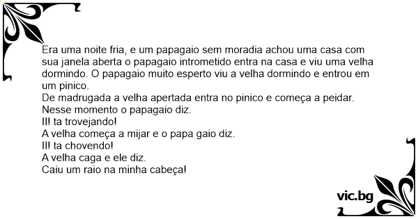 Era uma noite fria, e um papagaio sem moradia achou uma casa com sua janela aberta o papagaio intrometido entra na casa e viu uma velha dormindo. O papagaio muito esperto viu a velha dormindo e entrou em um pinico.