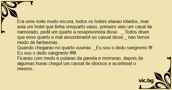 Era uma noite muito escura, todos os hoteis etavao lotados, mas avia um hotel que tinha umquarto vasio. primeiro veio um casal de namorado, pedil um quarto a resepisionista disse . _ Todos disen que esse quarto e mal assombrado! eo cassal disse _ nao temos medo de fantasmas .