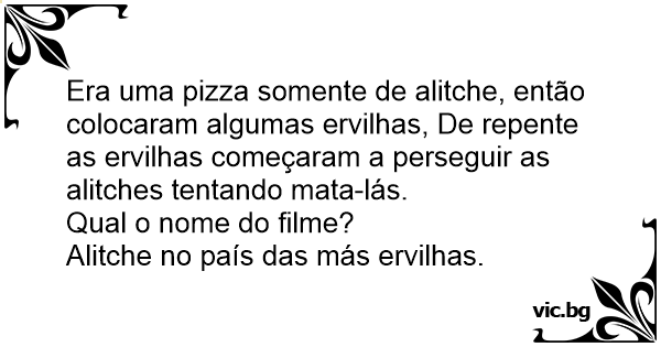 Era uma pizza somente de alitche, então colocaram algumas ervilhas, De repente as ervilhas começaram a perseguir as alitches tentando mata-lás.