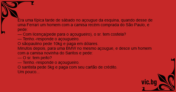 Era uma típica tarde de sábado no açougue da esquina, quando desse de uma Ferrari um homem com a camisa recém comprada do São Paulo, e pede: