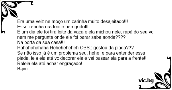 Se não isso já é um problema seu, hehe, e para entender essa piada, leia ela até vc decorar ela e vai passar ela para a frente!! Releia ela até achar engraçado!