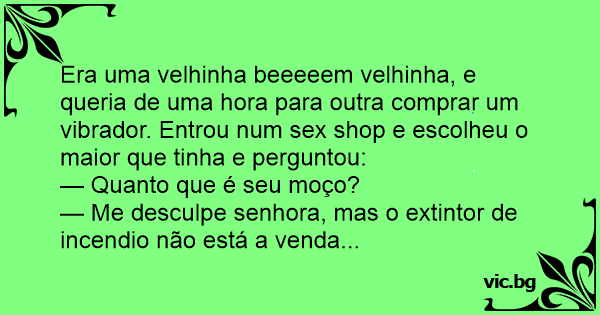 Era uma velhinha beeeeem velhinha, e queria de uma hоrа para outra comprar um vibrador. Entrou num sеx shop e escolheu o maior que tinha e perguntou: