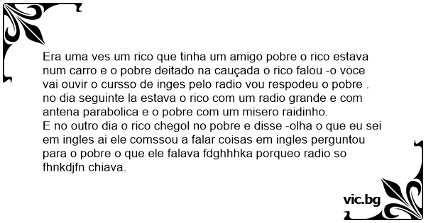Era uma ves um rico que tinha um amigo pobre o rico estava num carro e o pobre deitado na cauçada o rico falou -o voce vai ouvir o cursso de inges pelo radio vou respodeu o pobre . no dia seguinte la estava o rico com um radio grande e com antena parabolica e o pobre com um misero raidinho.