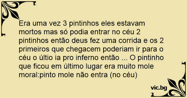 Era uma vez 3 pintinhos eles estavam mortos mas só podia entrar no céu 2 pintinhos então deus fez uma corrida e os 2 primeiros que chegacem poderiam ir para o céu o últio ia pro inferno então ... O pintinho que ficou em último lugar era muito mole moral:pinto mole não entra (no céu)