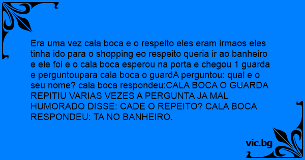 Era uma vez cala boca e o respeito eles eram irmaos eles tinha ido para o shopping eo respeito queria ir ao banheiro e ele foi e o cala boca esperou na porta e chegou 1 guarda e perguntoupara cala boca o guardA perguntou: qual e o seu nome? cala boca respondeu:CALA BOCA O GUARDA REPITIU VARIAS VEZES A PERGUNTA JA MAL HUMORADO DISSE: CADE O REPEITO? CALA BOCA RESPONDEU: TA NO BANHEIRO.