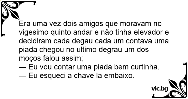 Era uma vez dois amigos que moravam no vigesimo quinto andar e não tinha elevador e decidiram cada degau cada um contava uma piada chegou no ultimo degrau um dos moços falou assim;