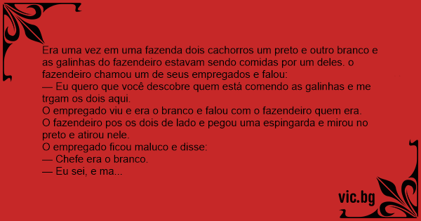 Era uma vez em uma fazenda dois cachorros um preto e outro branco e as galinhas do fazendeiro estavam sendo comidas por um deles. o fazendeiro chamou um de seus empregados e falou: