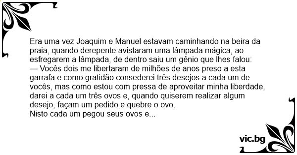 Era uma vez Joaquim e Manuel estavam caminhando na beira da praia, quando derepente avistaram uma lâmpada mágica, ao esfregarem a lâmpada, de dentro saiu um gênio que lhes falou: