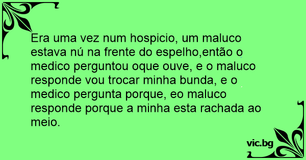 Era uma vez num hospicio, um maluco estava nú na frente do espelho,então o medico perguntou oque ouve, e o maluco responde vou trocar minha bunda, e o medico pergunta porque, eo maluco responde porque a minha esta rachada ao meio.